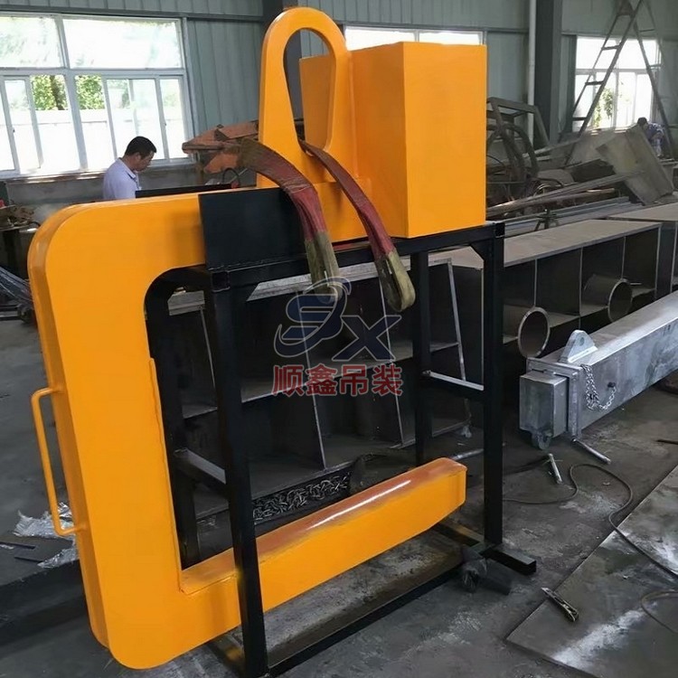 C型吊具適用于鋼卷的水平吊運,由吊具體和配重鐵組成。主體部分由合金鋼和鋼管拼接而成,截面為箱型結(jié)構(gòu),配重鐵起調(diào)節(jié)吊具平衡的作用,使吊具和被吊物的重心在一條線內(nèi)。載荷范圍:3.2-32噸。